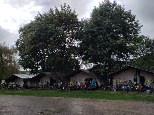 Kurze Fahrt zu unserem ersten Camping im Regen. Alle sind wohlauf, munter und fröhlich gestartet. So schön, unterwegs zu sein!